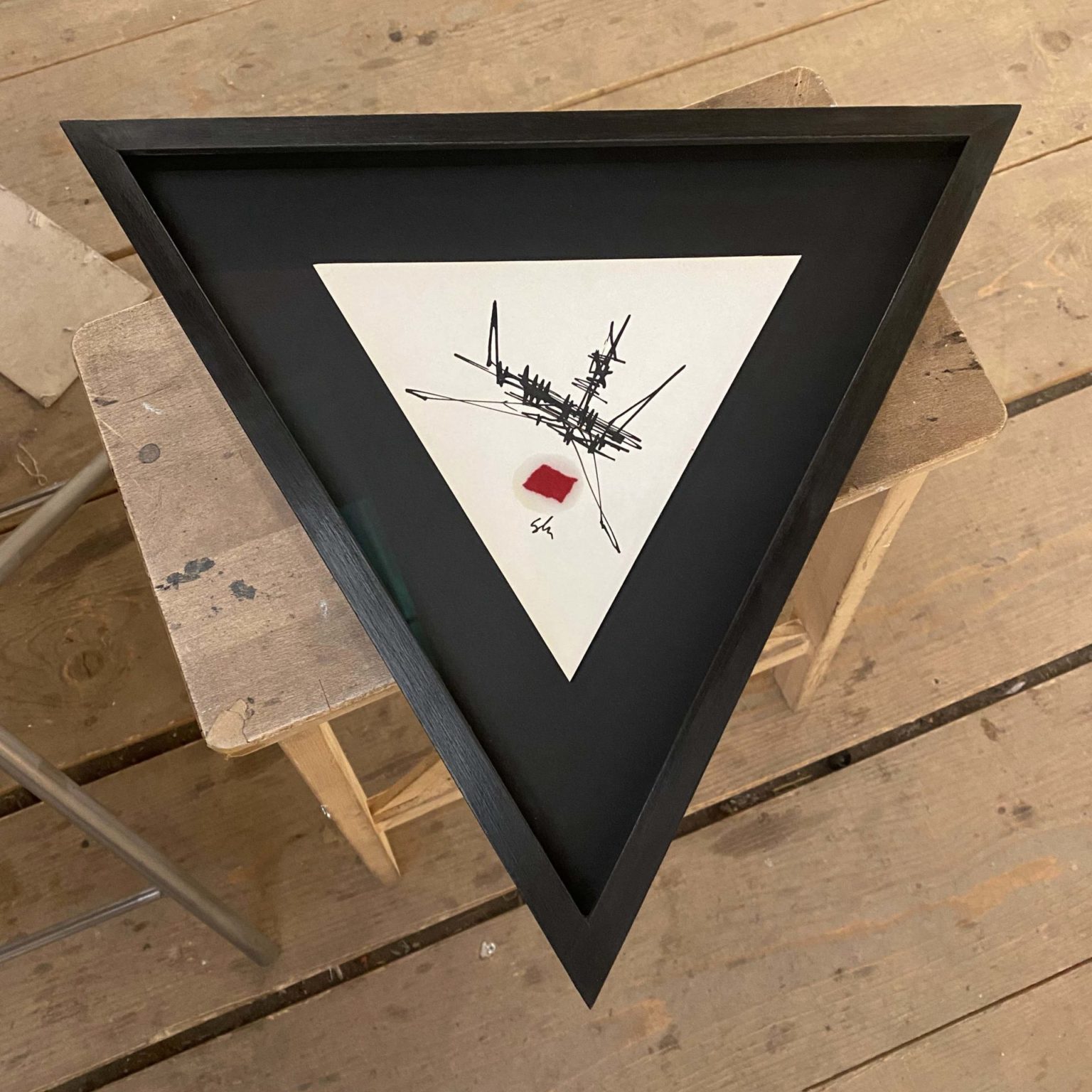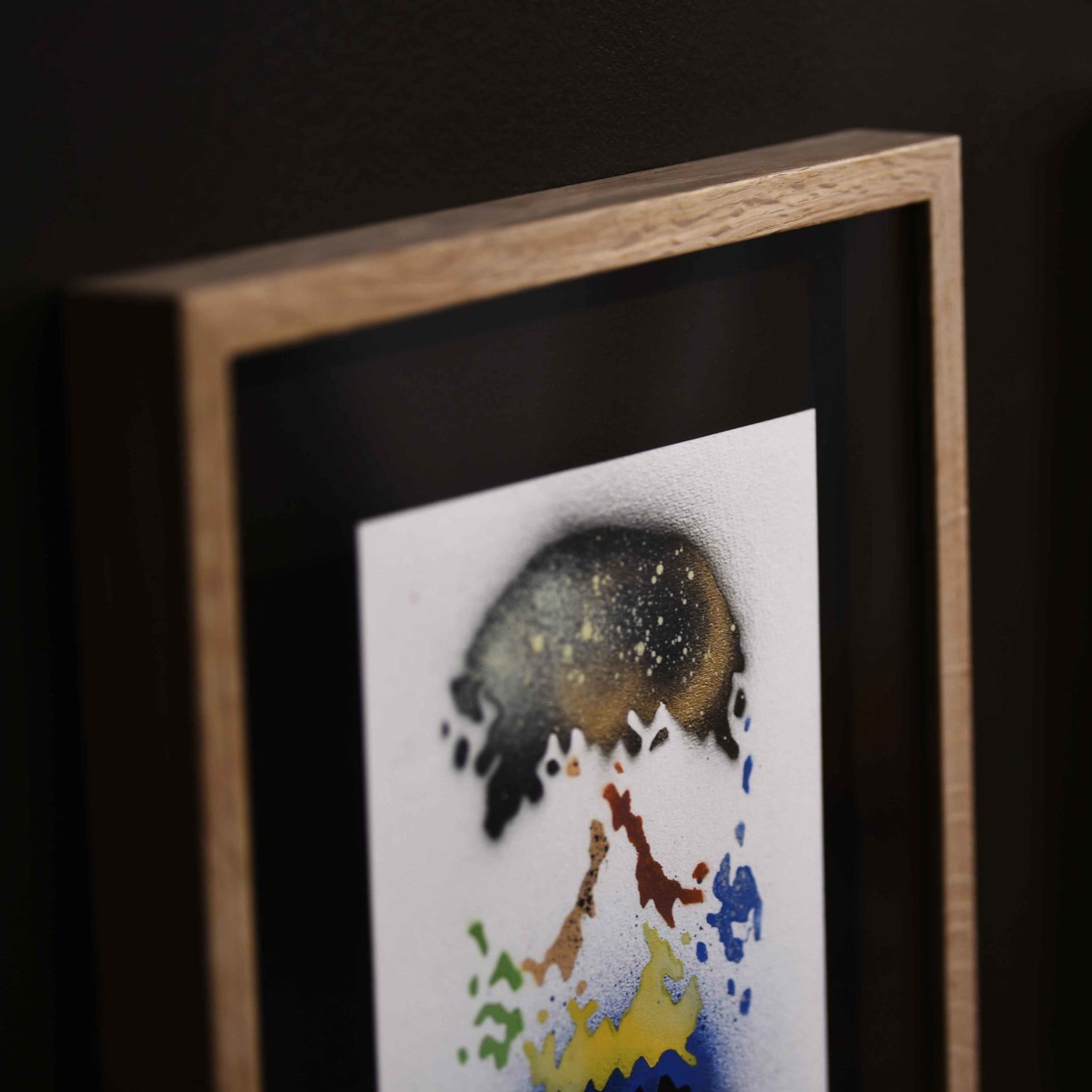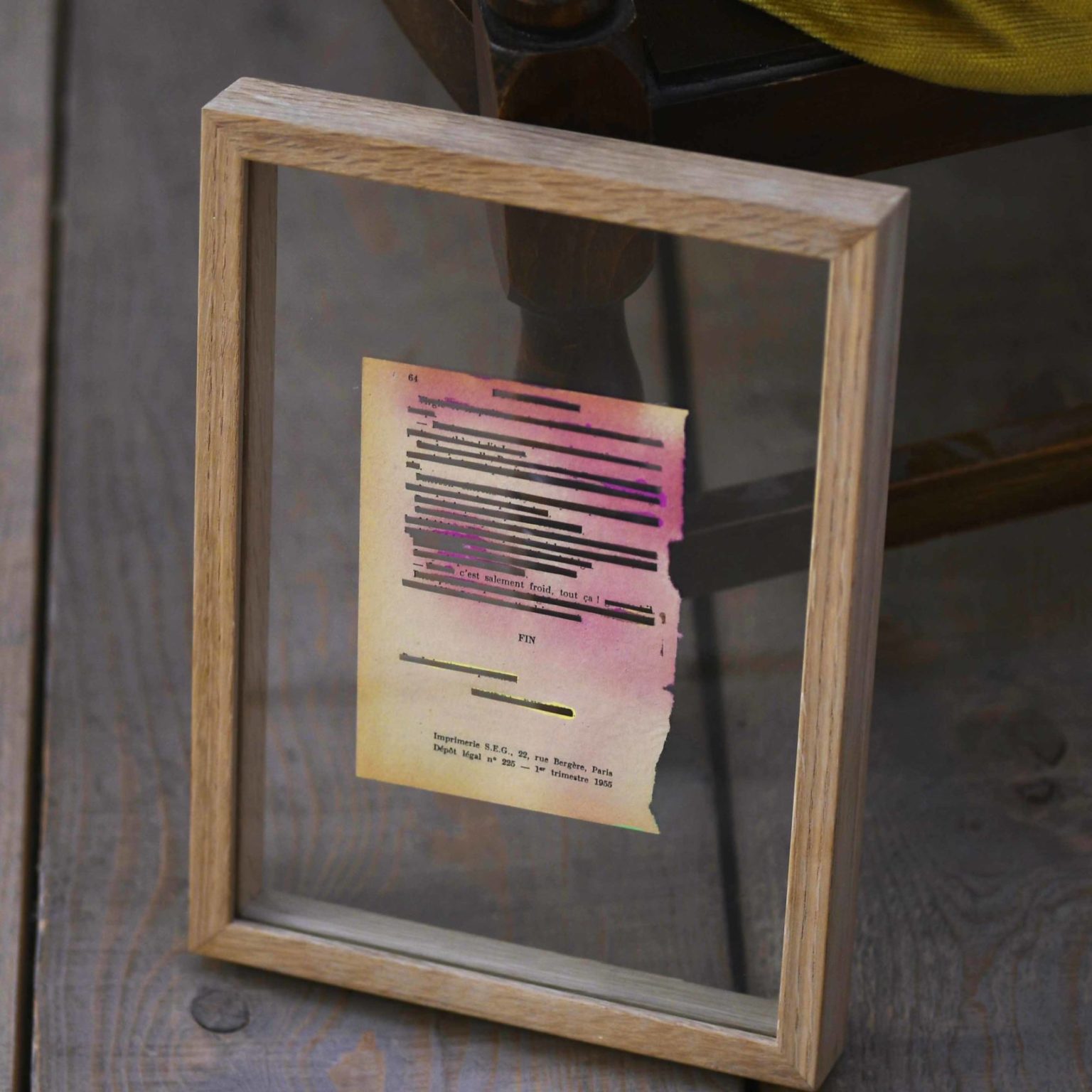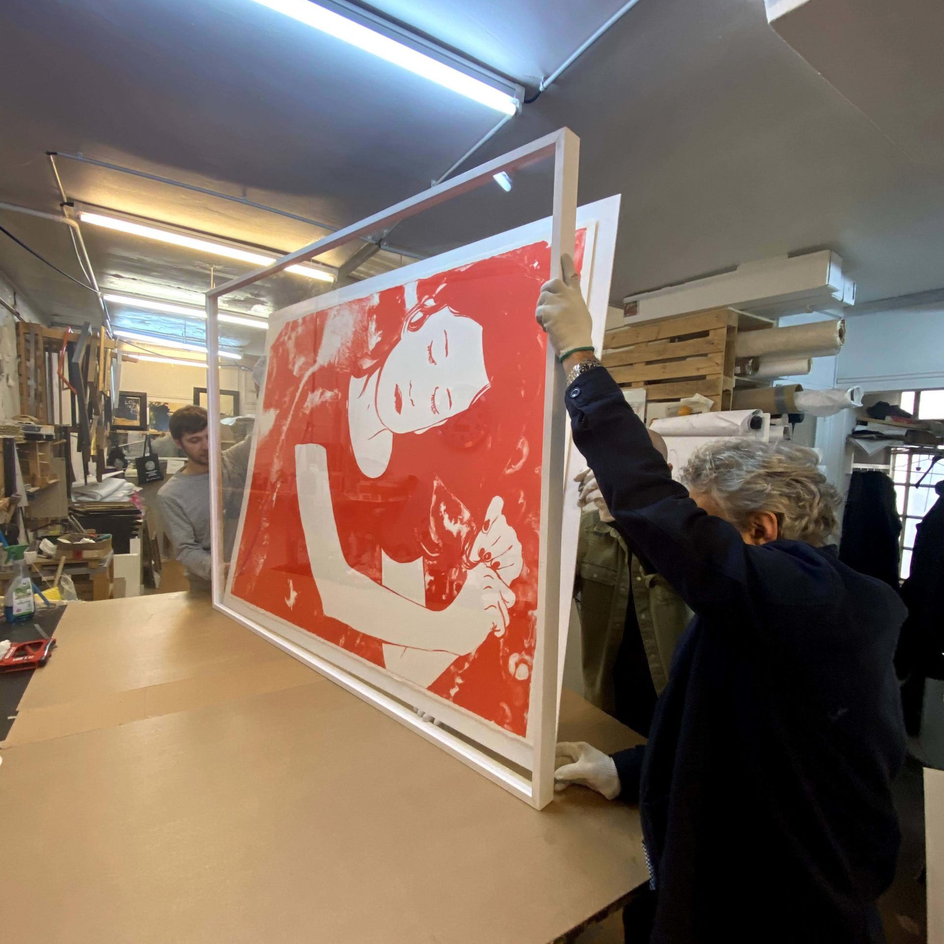 L’œuvre est fixée sur un fond de couleur, puis entourée d’un passe-partout : un double effet qui renforce l’impact visuel.