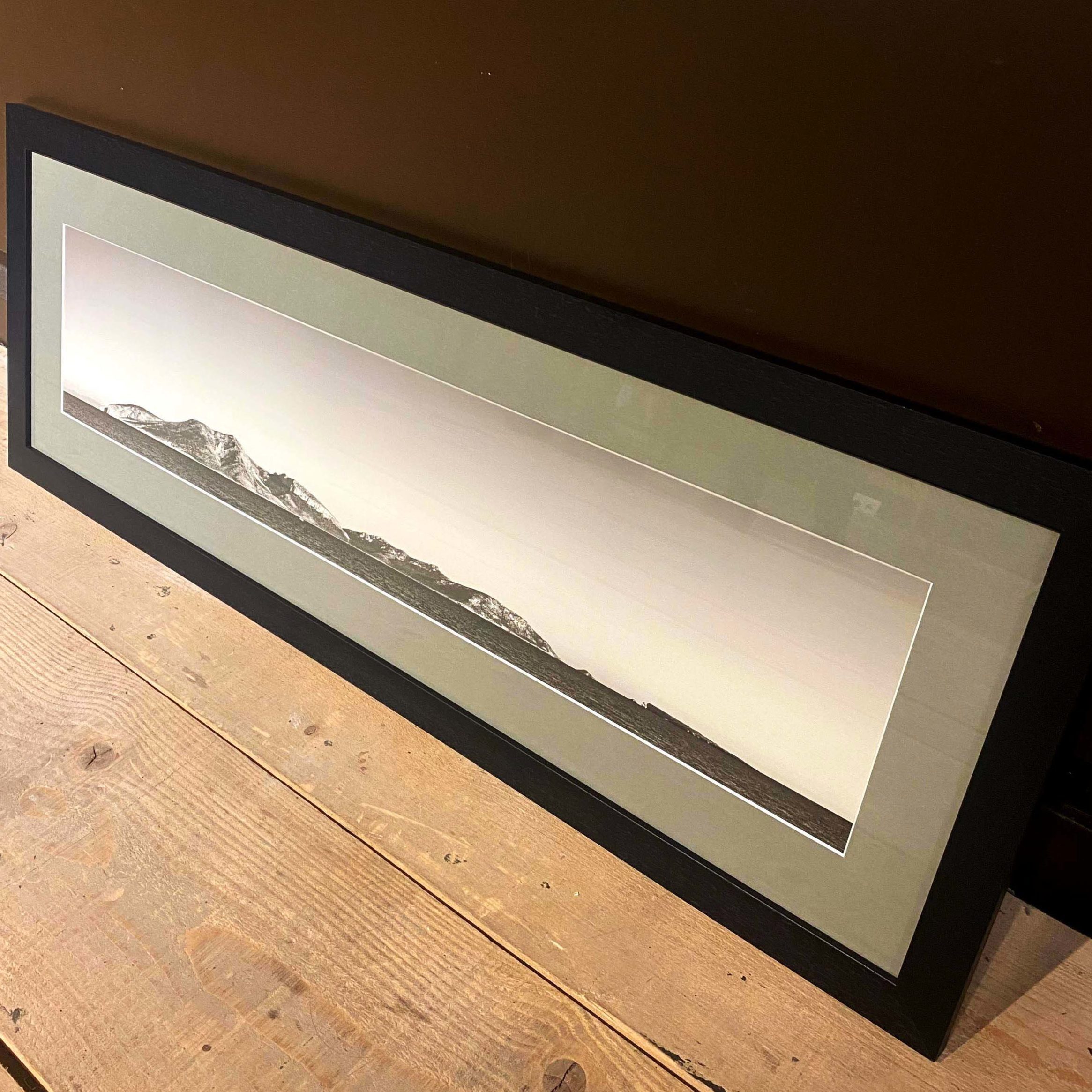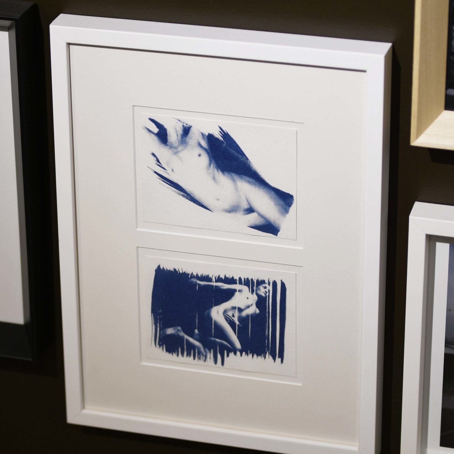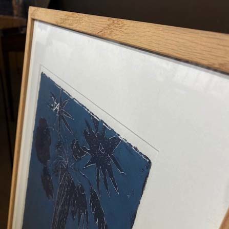 L’œuvre est placée sous un passe-partout (blanc ou coloré), qui apporte de la profondeur et agrandit visuellement la pièce.