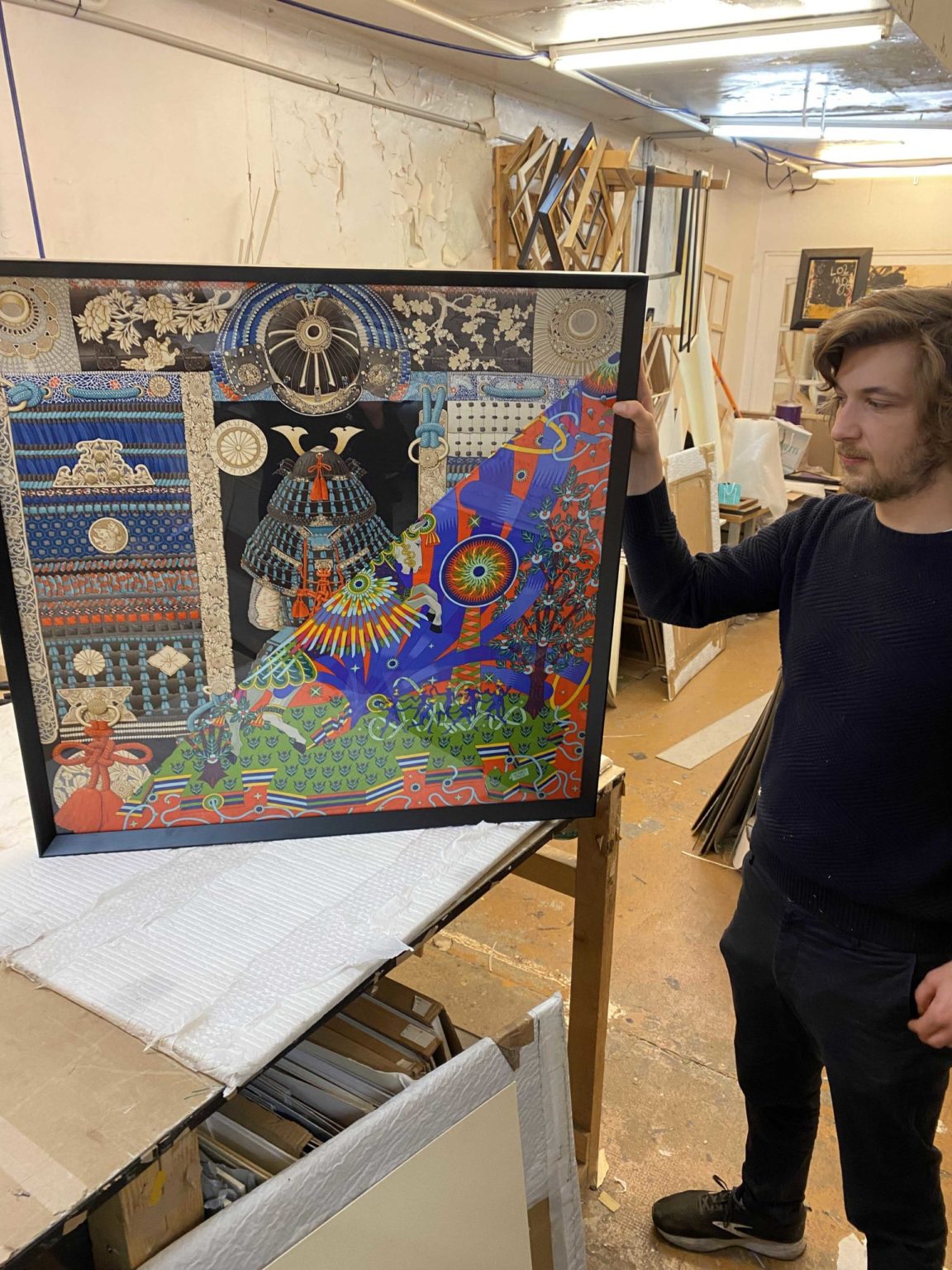 L’œuvre est fixée sur un fond (couleur au choix), avec des marges ajustables pour agrandir visuellement l’encadrement.