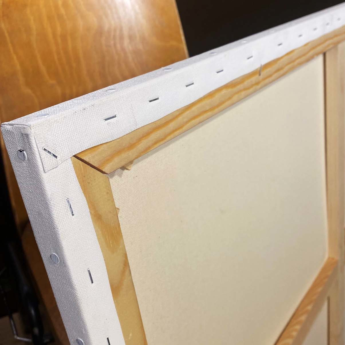 La toile est tendue sur un châssis, prête à être encadrée dans une caisse américaine ou à être exposée telle quelle.