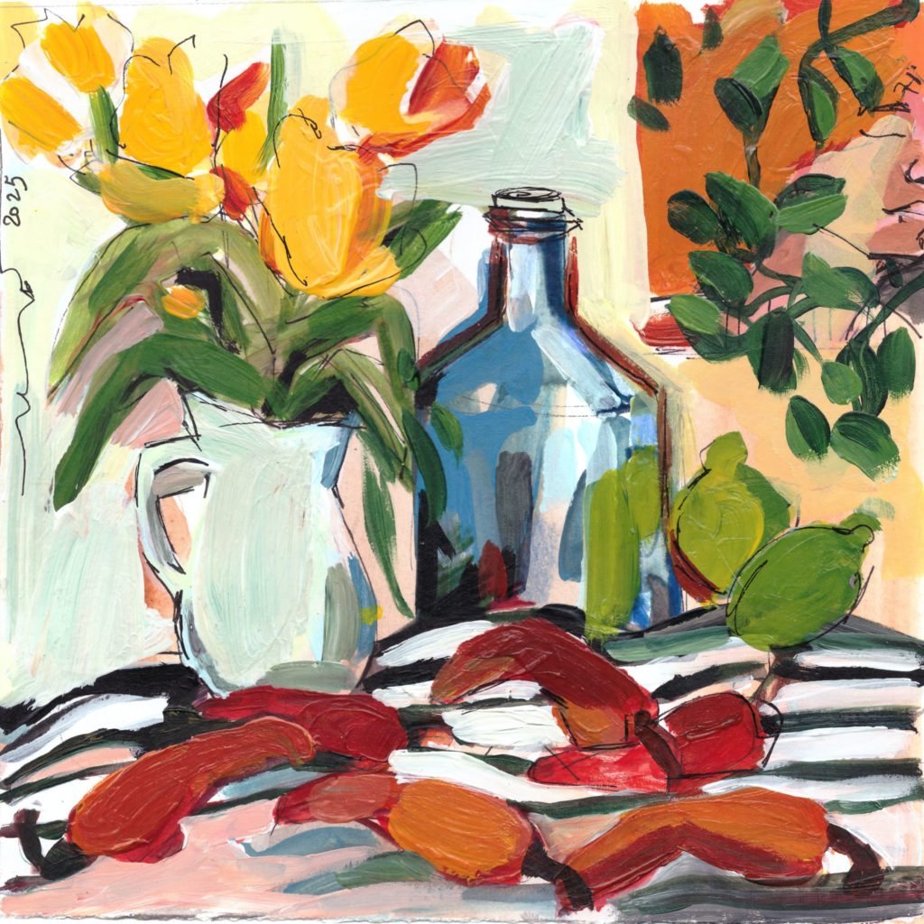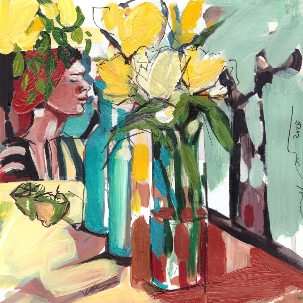 Golnaz Afraz rend hommage au quotidien, dans toute sa complexité colorée. Depuis son départ de l’Iran il y a 17 ans, son quotidien a changé, et sa peinture en porte les empreintes. Dans ses œuvres, elle juxtapose des couches temporelles, des formes superposées, des vides assumés. Une manière de laisser le regardeur respirer, imaginer, entrer dans la composition. Sa palette vive devient un langage à part entière, entre mémoire, déplacement et perception. Pour les 30 ans de la galerie, elle présente une série sensible et intuitive mêlant natures mortes, portraits et corps, comme autant d’instants suspendus.