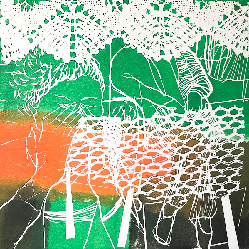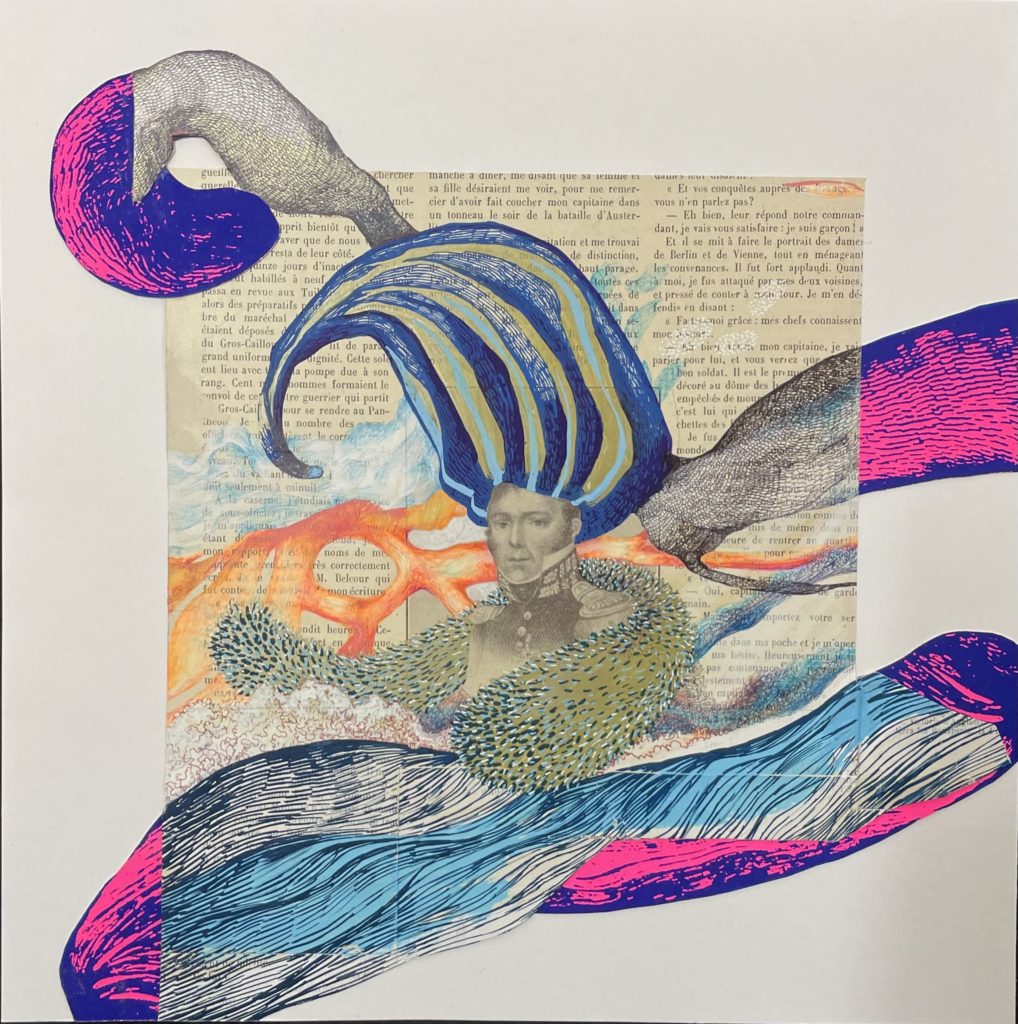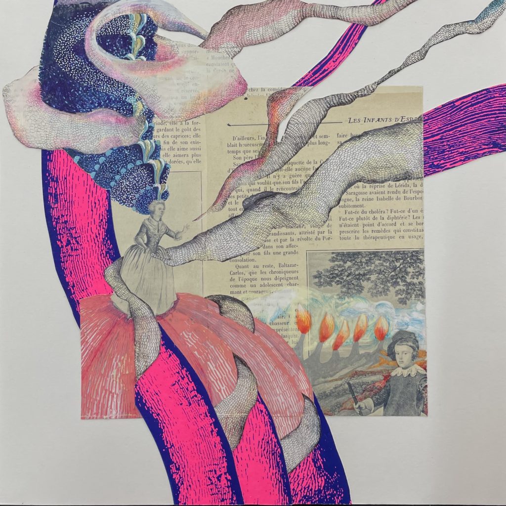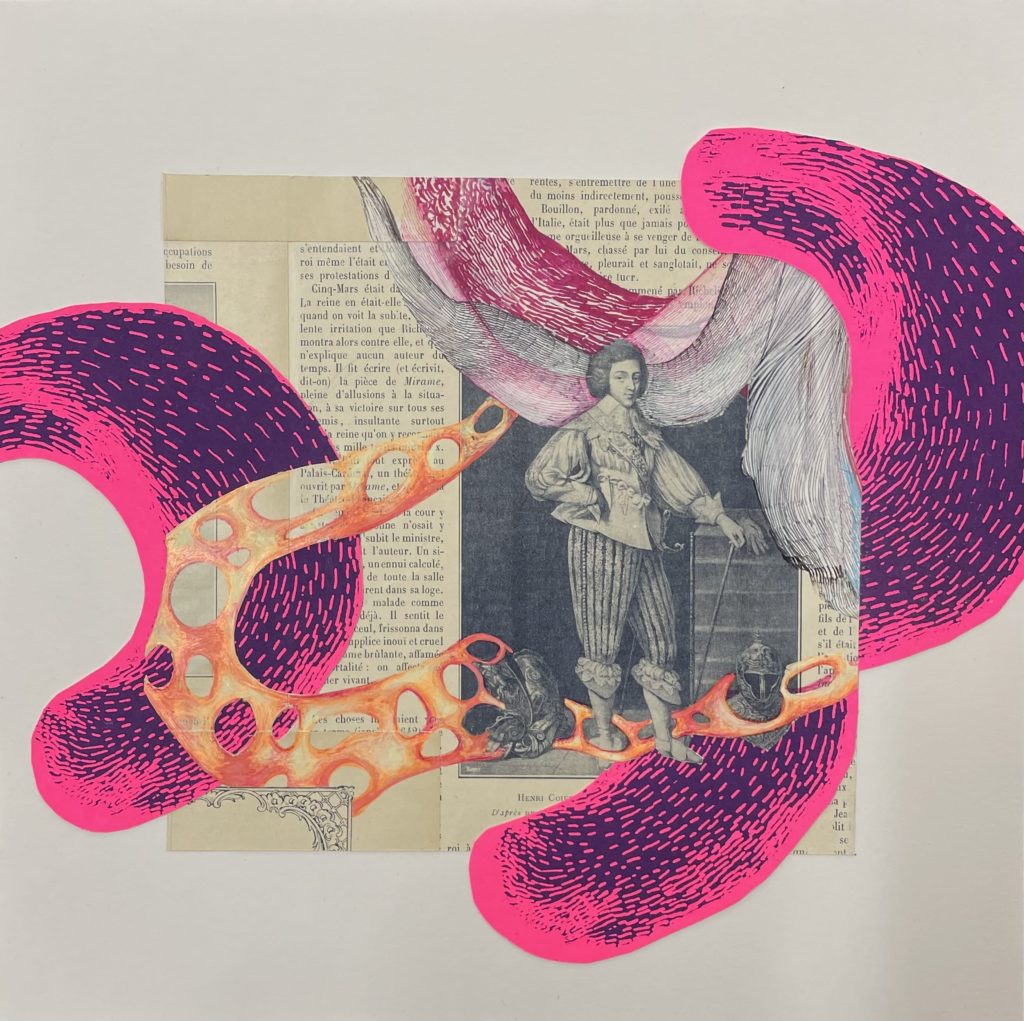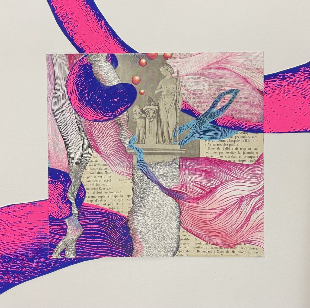 Marlène Chevalier s’intéresse au langage, à la mémoire et à la manière de faire exister ces dimensions intimes à travers le geste artistique. Elle cherche à matérialiser la complexité des sentiments, à retranscrire les traces émotionnelles, les souvenirs, les répertoires sensibles qui nous traversent. Dans la série exposée, elle réunit deux pratiques qui lui sont chères : le dessin sur papier ancien et la sérigraphie. “L’intention autour de ces collages était avant tout de faire se rejoindre deux expériences que j’ai beaucoup aimé, le dessins sur papier ancien et la sérigraphie, m’offrir un moment de composition libre”. Un travail délicat et introspectif, à la croisée de l’écriture visuelle et de l’émotion à fleur de peau.