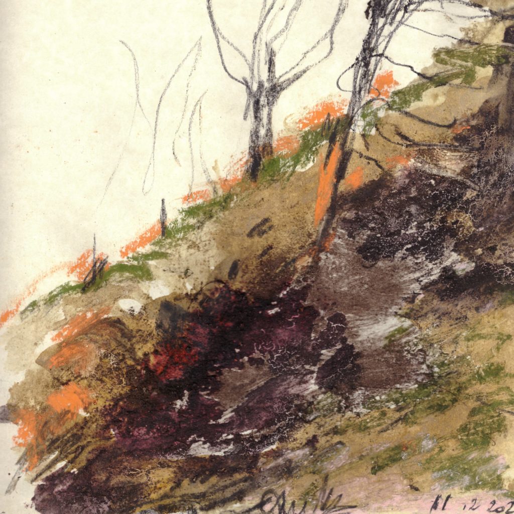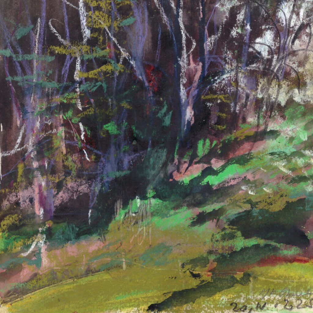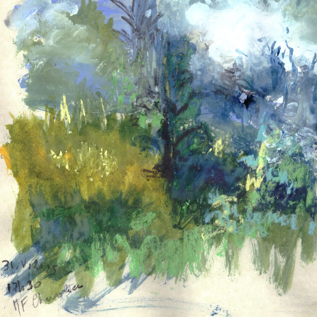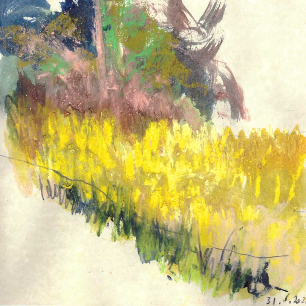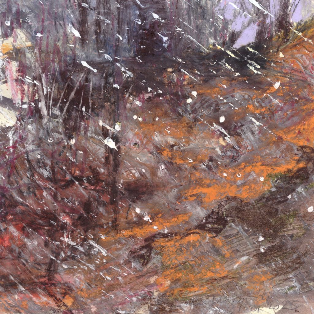 Marie-France Chevalier est une artiste peintre, qui partage sa vie entre Lyon et le plateau du Vercors.Diplômée des Beaux-Arts de Lyon, elle explore la mémoire, le paysage et la transformation des lieux à travers des médiums variés. Elle s’intéresse également, à la nature, aux corps, en particulier féminins, qu’elle représente dans leur évolution et leur métamorphose. Marie-France Chevalier crée chaque jour une image inspirée de son paysage quotidien. Sa peinture suit le rythme des saisons, des lumières, des gestes. Un rituel d’atelier devenu offrande visuelle. Dans la répétition se cache une poésie du présent, un lien humble entre le regard et le monde. Pour les 30 ans de la galerie, elle relève le défi du petit format, en en faisant un haïku visuel, une lettre poétique.
