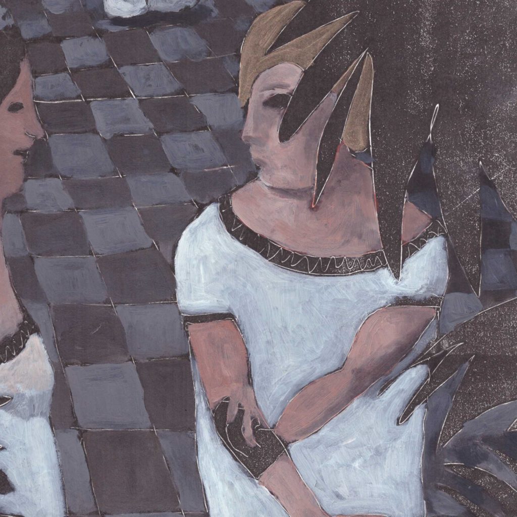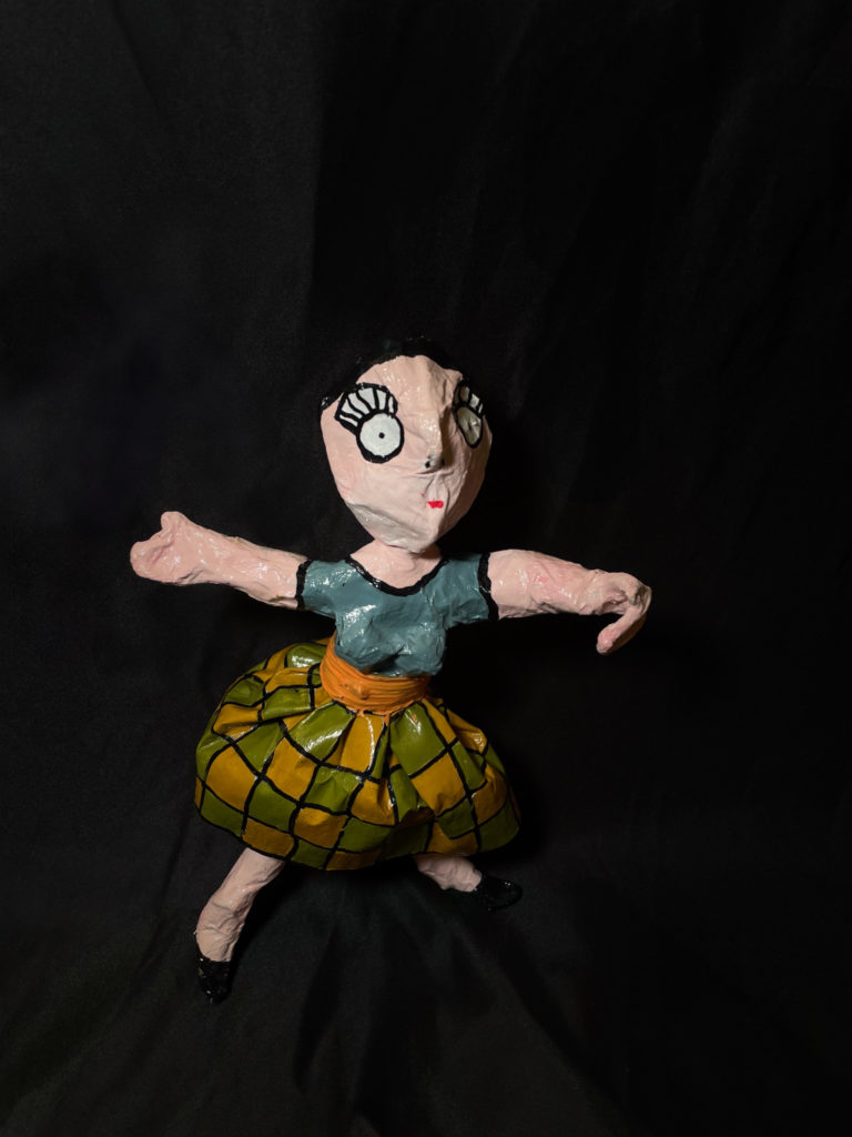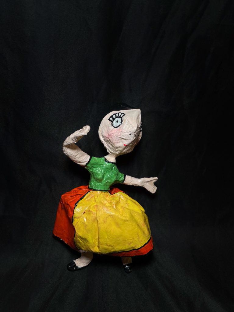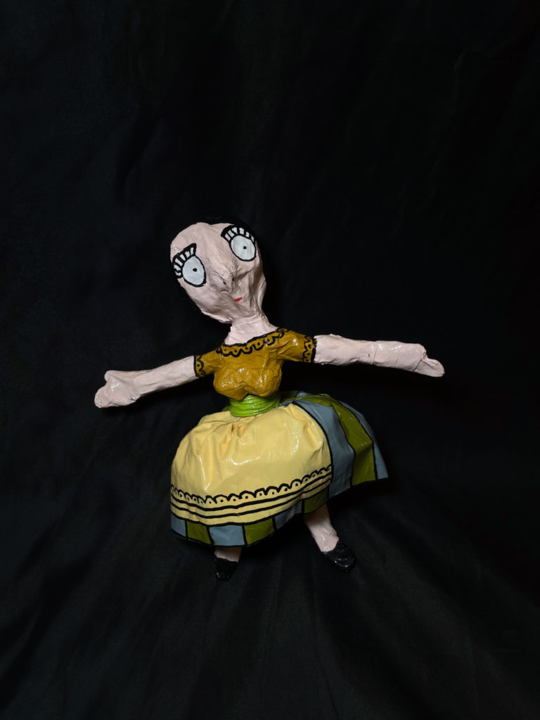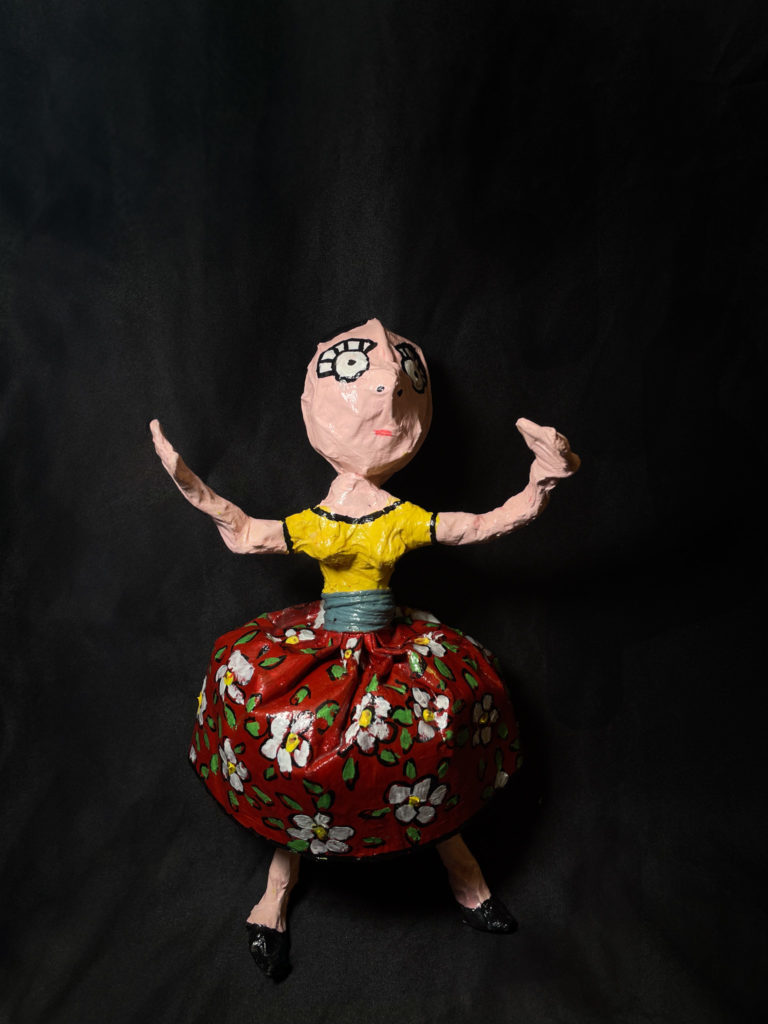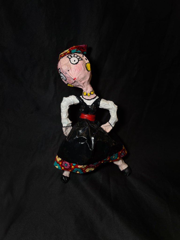 Née à Porto en 1961, Cristina Tavares, peintre et plasticienne, s’inspire du drame et du souvenir. Elle vit et travaille en France depuis 1983. Formée à la peinture et au piano, elle développe depuis plus de 30 ans une œuvre dramatique et poétique, marquée par la mémoire, les origines et la fragilité humaine. Ses figures, souvent en état de tension ou d’abandon, évoquent une forme de résistance intérieure. Elle expose en France et à l’international, et collabore aussi avec le spectacle vivant. Pour les 30 ans, elle crée des poupées inspirées du folklore portugais. Un défi pour elle et une manière de chambouler ses habitudes… “et aussi pour embêter l’encadreur aha !”