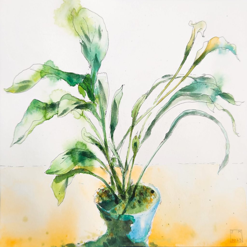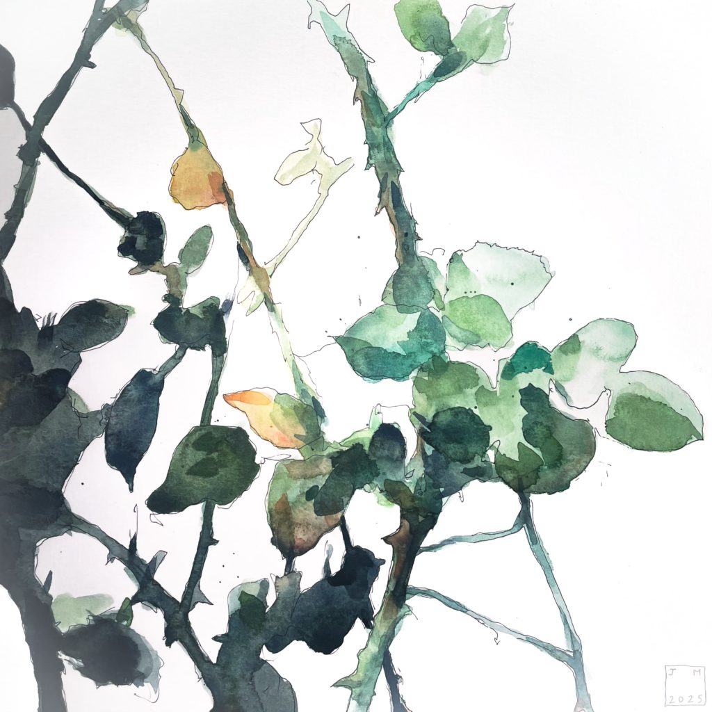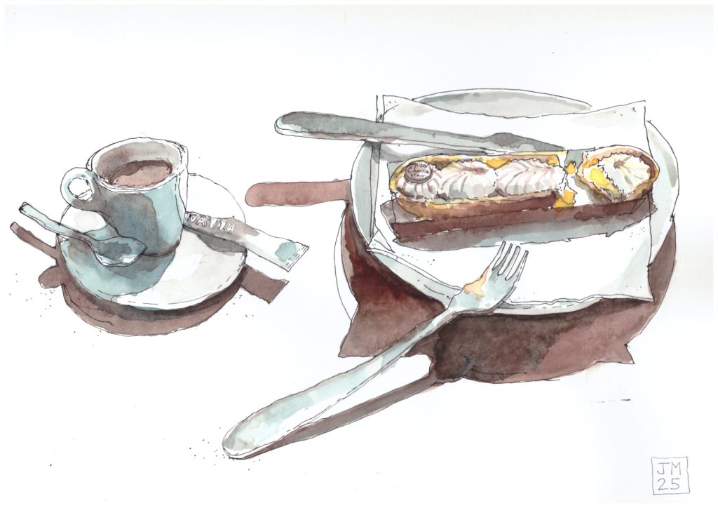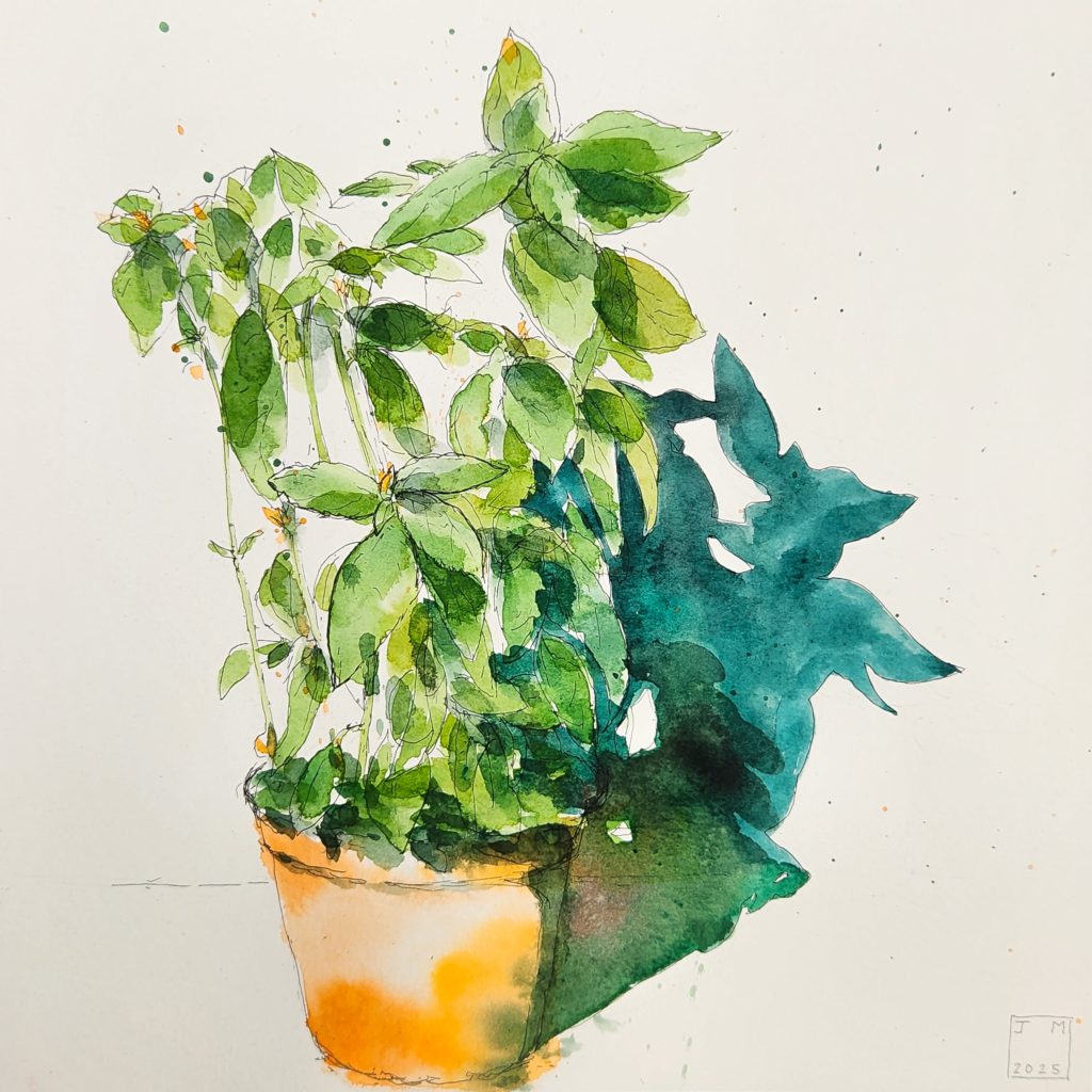 Né à Bron en 1977, Jérôme Moreau dessine depuis toujours. “Mes études en arts appliqués m’ont amené à remplir mes premiers carnets de croquis, en observant ma famille et les paysages de Vendée” Formé aux arts appliqués puis aux Beaux-Arts de Saint-Étienne, il a développé une pratique ancrée dans l’observation du quotidien : “ croquer les choses et les lieux qui nous entourent, avec une attention particulière “. Il alterne le crayon graphite, l’encre et l’aquarelle, appréciant la spontanéité et l’imprévisibilité de cette dernière. Qu’il s’agisse de fleurs ou de scènes de vie simples comme un goûter, ses dessins captent l’instant avec justesse et tendresse.
