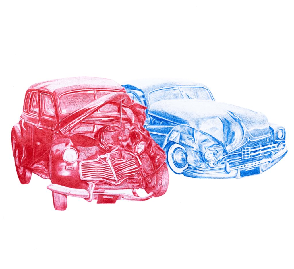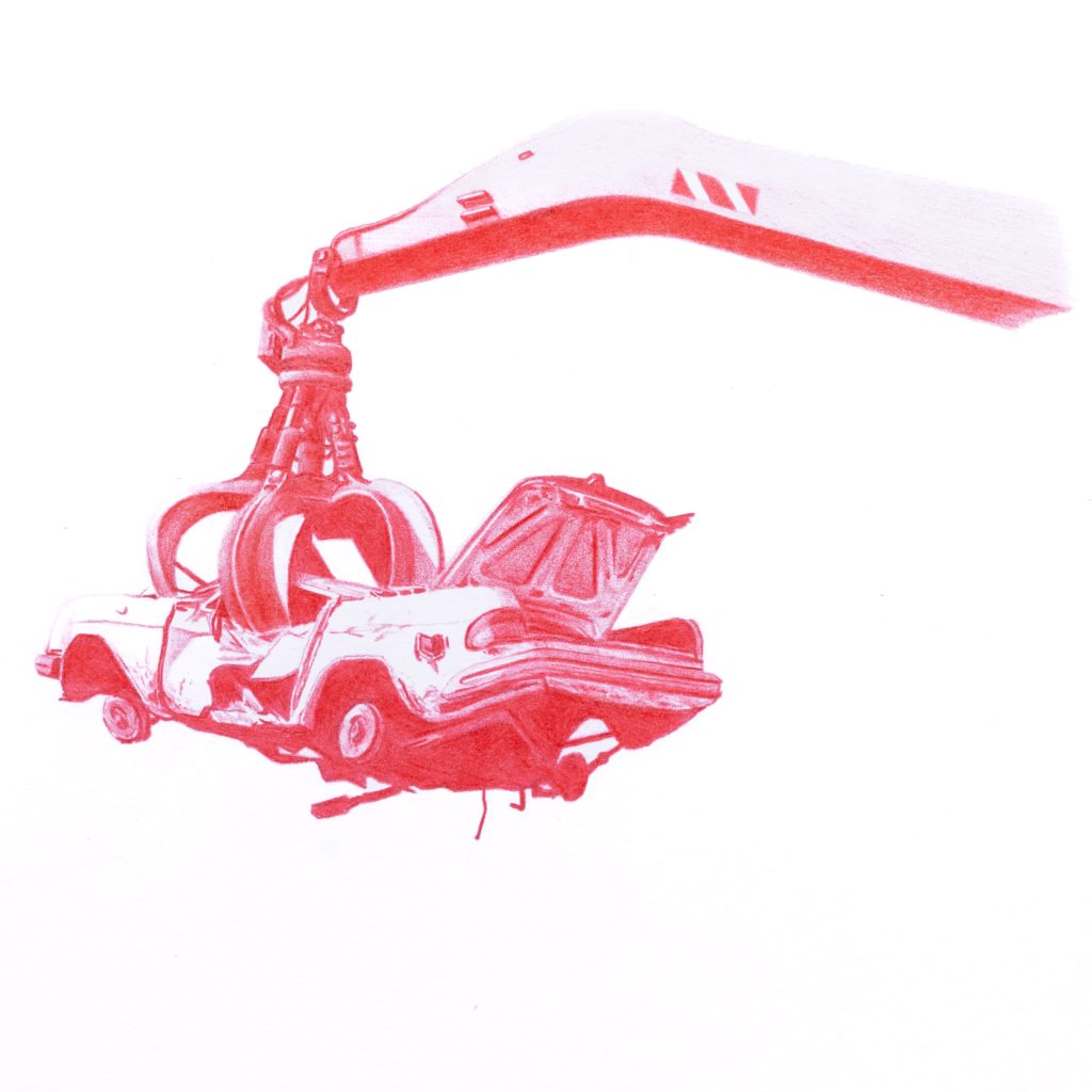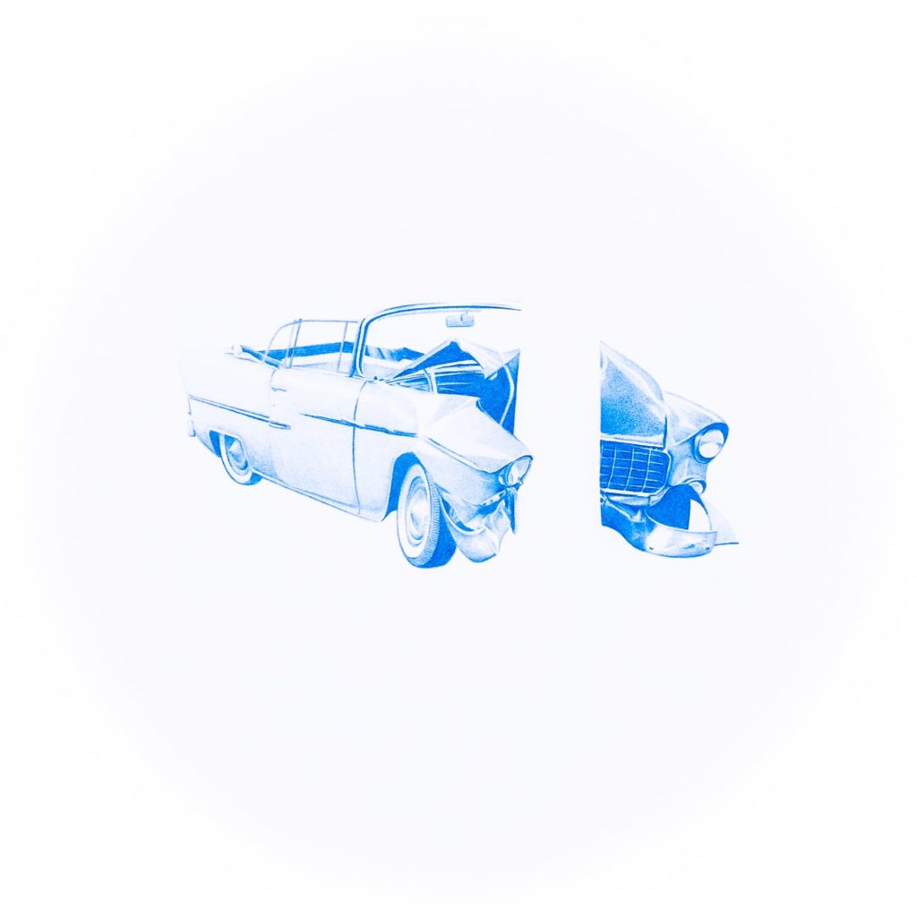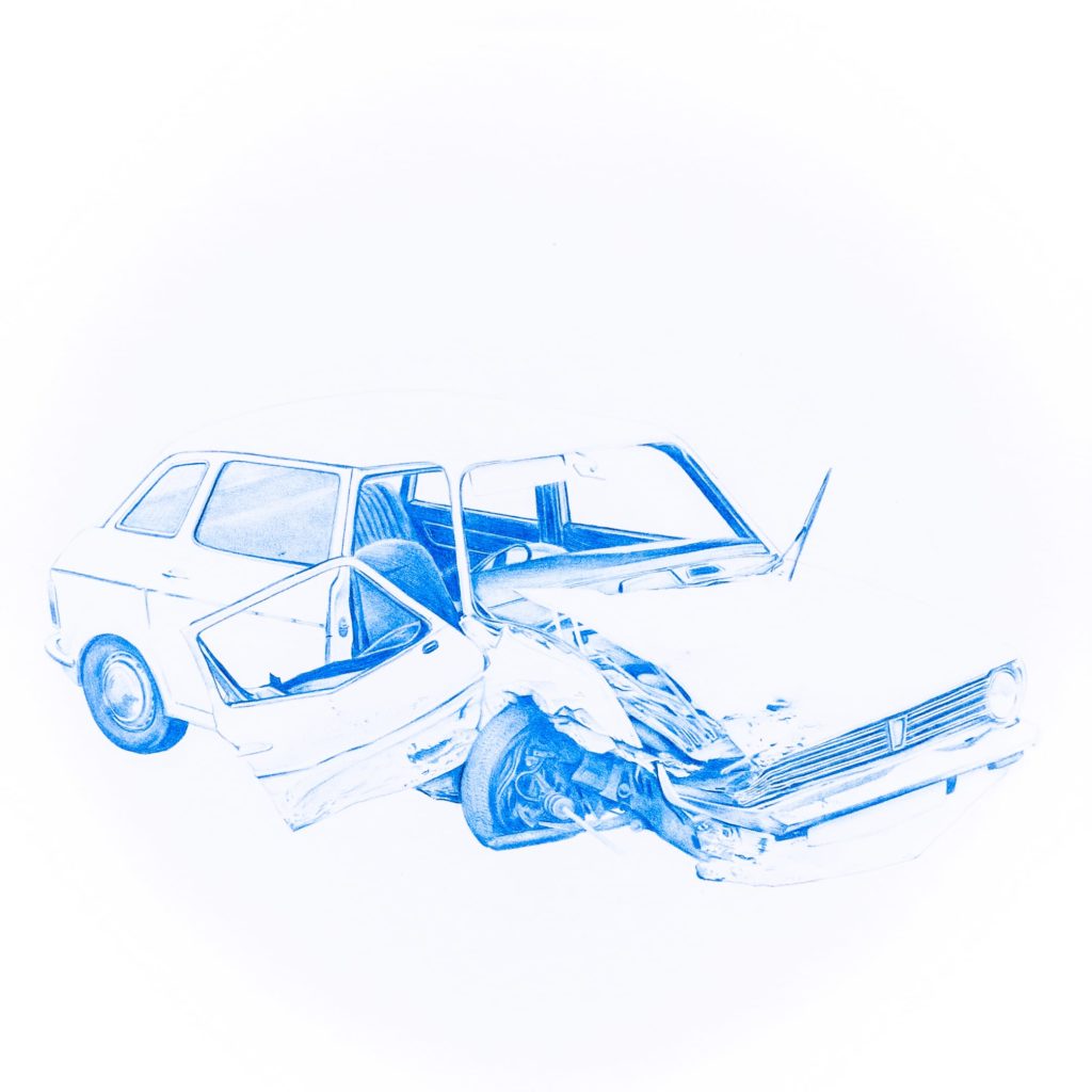 Ingénieur devenu dessinateur, Louis Rolland a trouvé sa voix au critérium après un parcours singulier. Diplômé de l’École Émile Cohl en 2023, il expose aujourd’hui pour la deuxième fois à la galerie Autour de l’Image. Sa série s’attache à révéler la beauté fragile des voitures anciennes, mais pas n’importe lesquelles : celles accidentées, où la tôle froissée dévoile presque organiquement leur mécanique interne. Une réflexion poétique sur la vanité, où chaque dessin devient le reflet d’histoires brisées, d’instants suspendus.